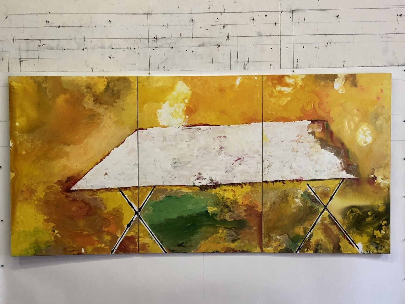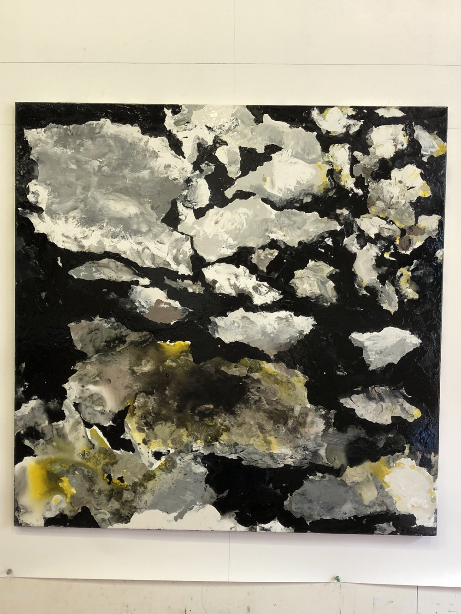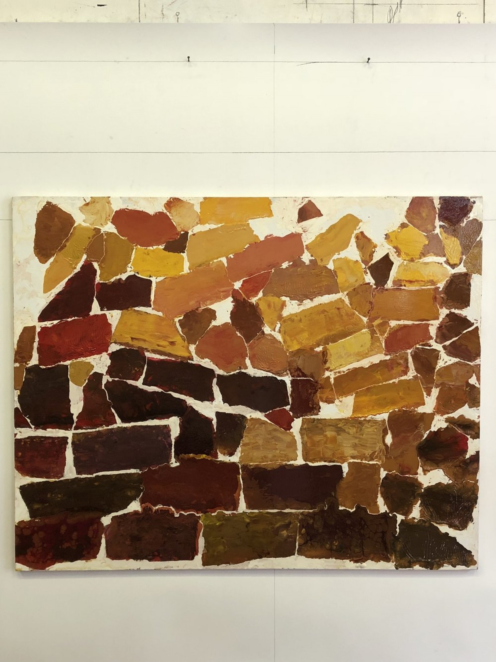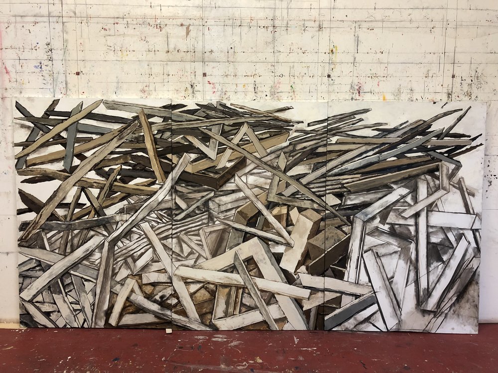 Nel caso di Giuliano Collina, come scrive Stefano Roberto Mazzatorta, «si può parlare di una poetica del frammento (rafforzata -per così dire- dalla pratica pop) che percorre come un fiume carsico tutta la sua storia pittorica: dagli inizi, in cui a essere dipinte sono, oltre alle parti di corpo, singoli oggetti privi di contesto (una valigia, una camicia) e poi corpi incompleti, ombre, sagome, tovaglie, sedie … tutte tracce di esistenze intere, o, come scrive l’artista, “solo le tracce, i contorni, i simulacri per esempio di tutte le figure umane mai dipinte.” […] In alcuni dei Cantieri, la poesia della traccia è espressa tramite la replicazione del frammento, o meglio, tramite la scelta di rappresentare una porzione, cioè un frammento, di un oggetto per sua natura composto da una pluralità di elementi in sé definiti: mattoni, sampietrini. Anche in questo modo d’operare si può ravvisare un’ascendenza pop: la riflessione sulla replicazione delle immagini, tipica della cultura visuale e comunicativa di massa. Ma quest’anima, nella serie esposta, trova una sua peculiare esteriorizzazione in uno sguardo rivolto non agli strumenti e ai modi espressivi della comunicazione contemporanea, secondo una logica cara agli artisti propriamente pop, ma spostato sui codici espressivo-informativi funzionali, quali la segnaletica cantieristica (il semaforo e il triangolo); immagini che non riproducono l’immagine del mondo, ma che ad esso fanno riferimento, che lo richiamano senza rappresentarlo direttamente».